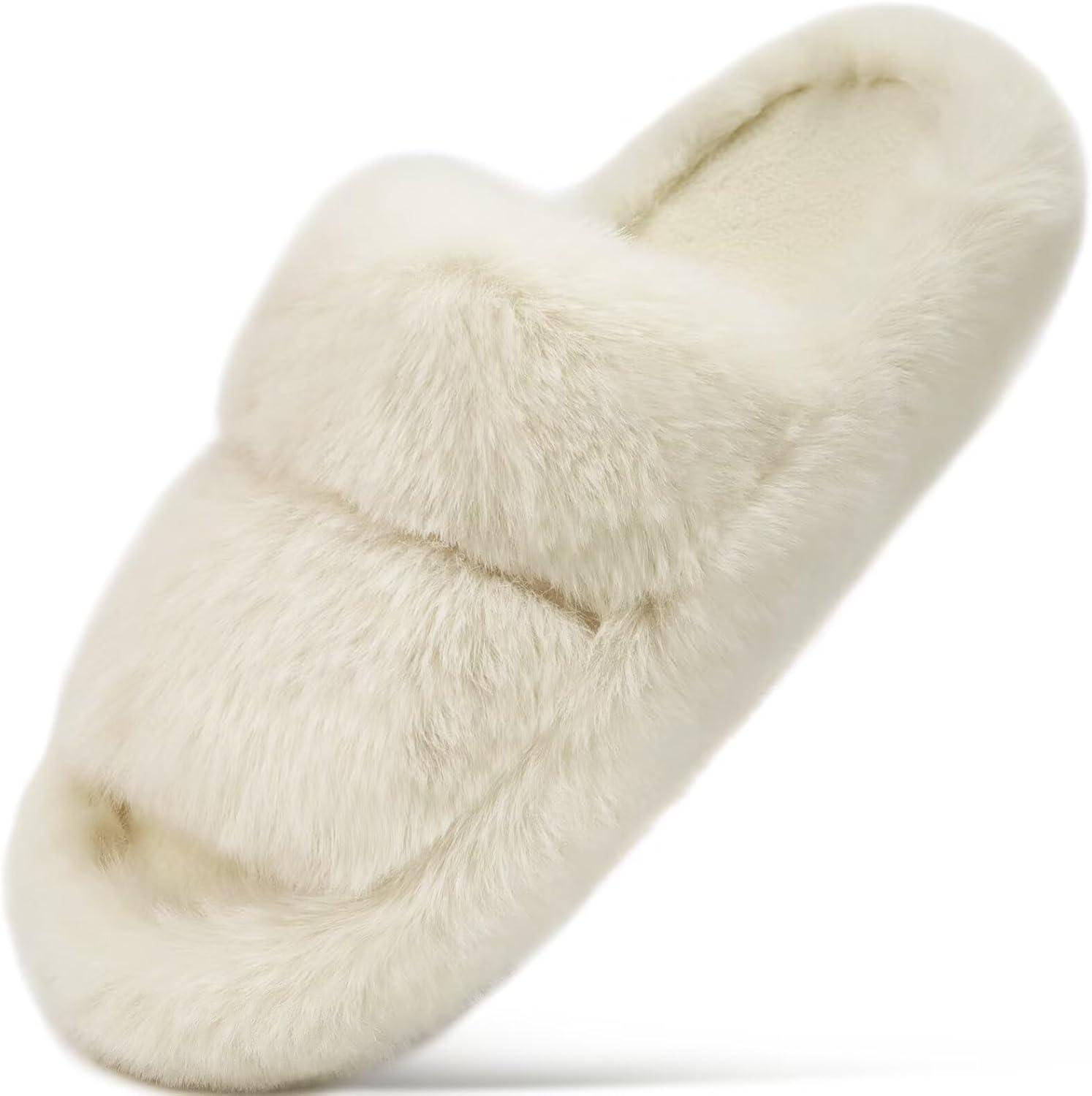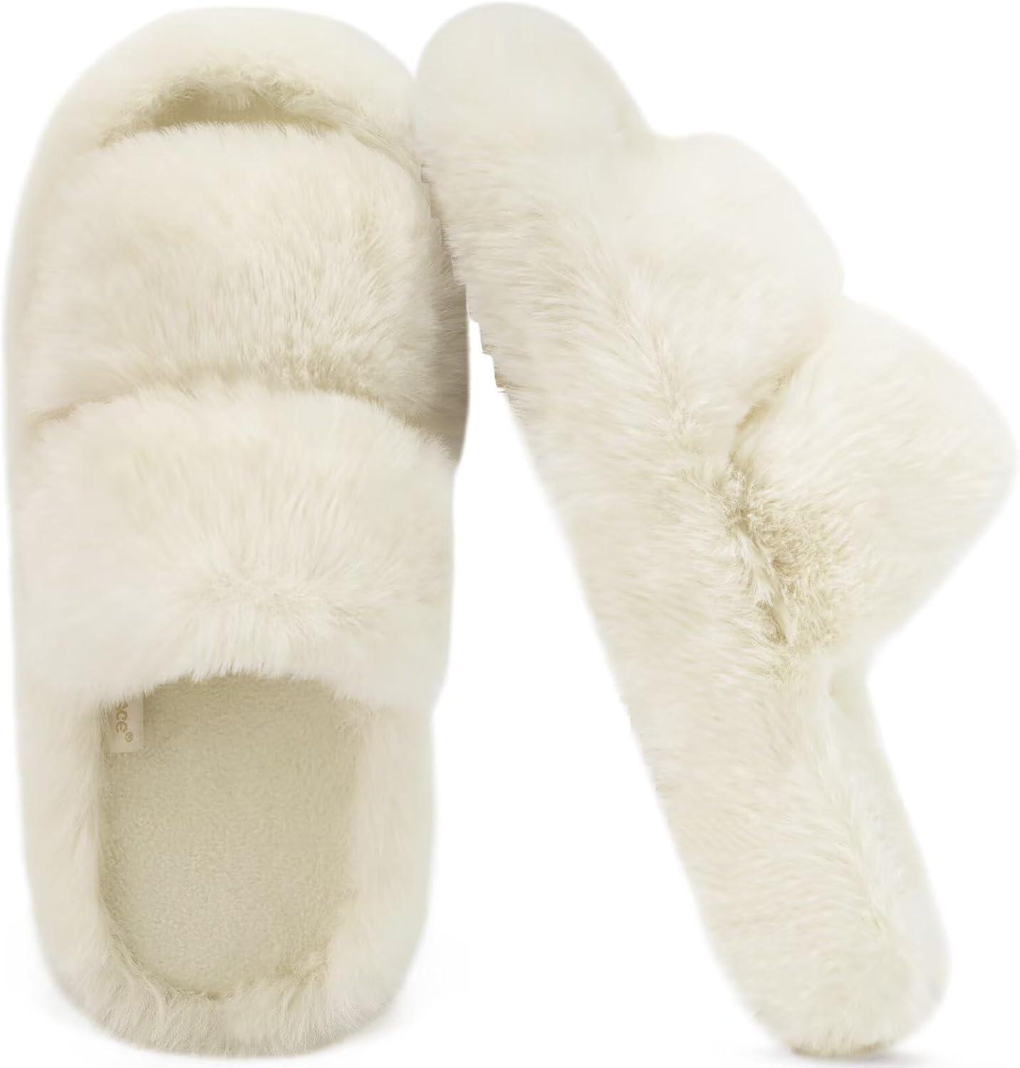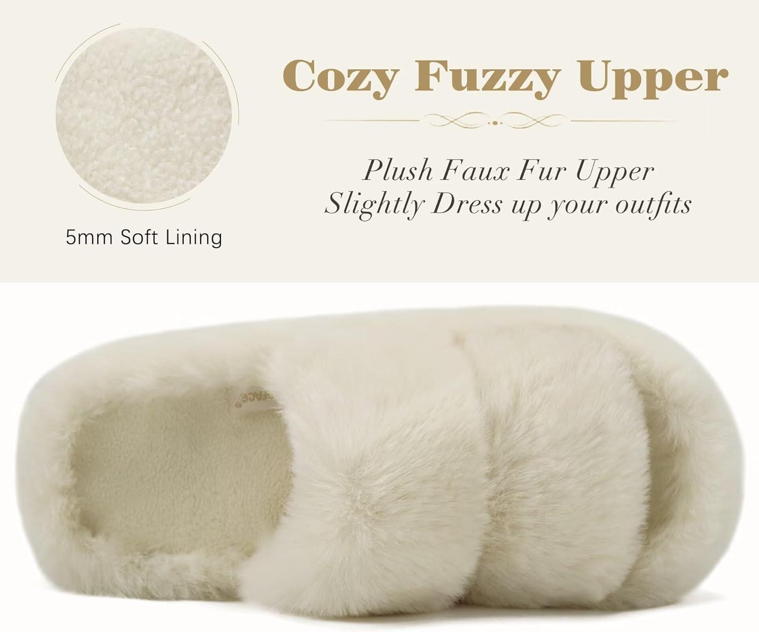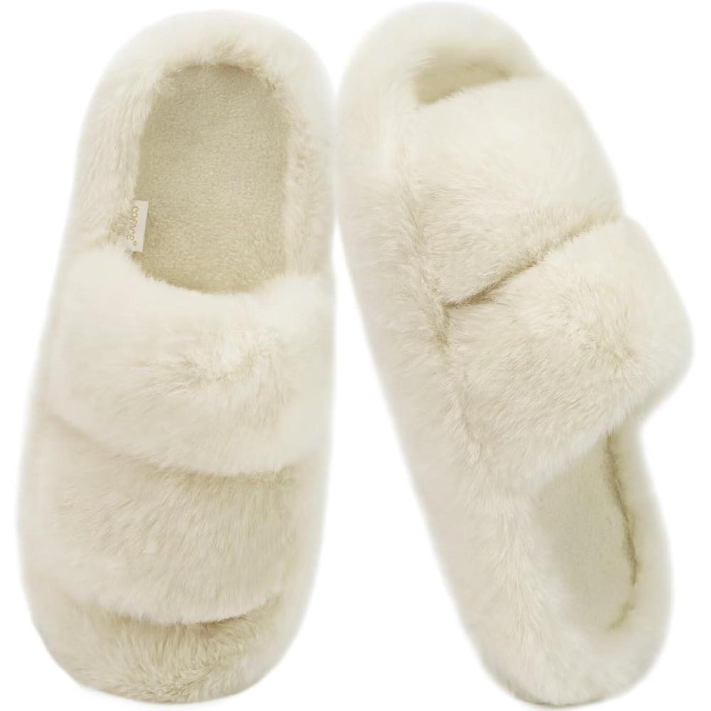 COFACE Women’s Fuzzy Slippers Memory Foam Open Toe Slip On House Shoes Size 5-11(Beige)
