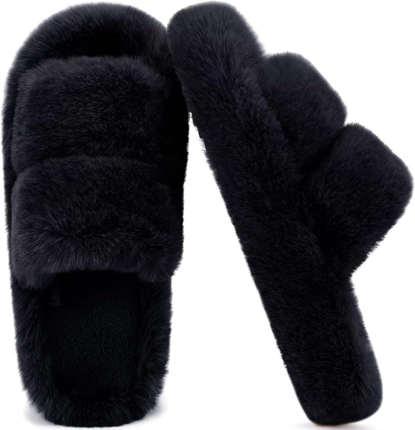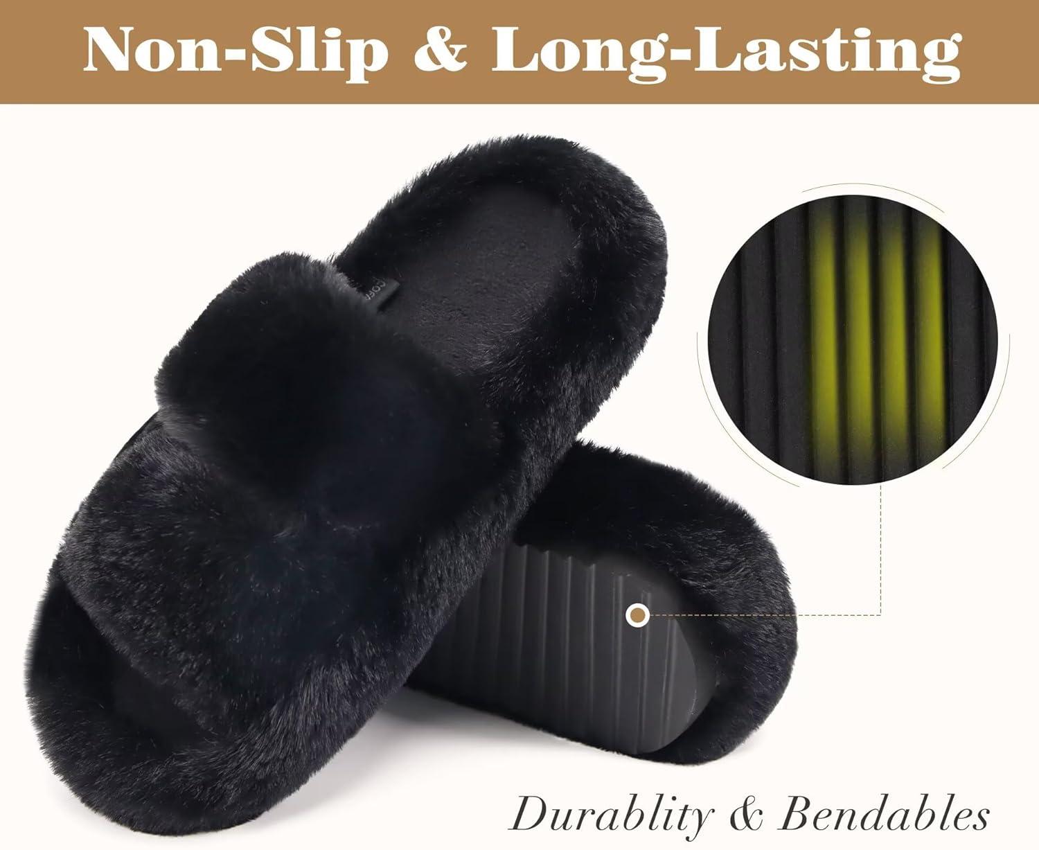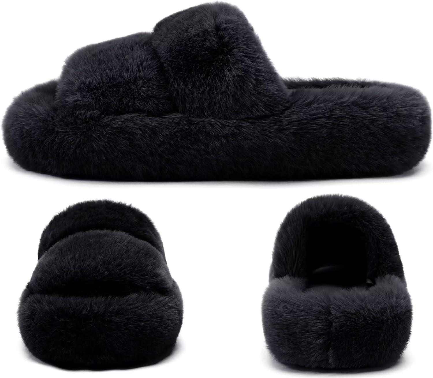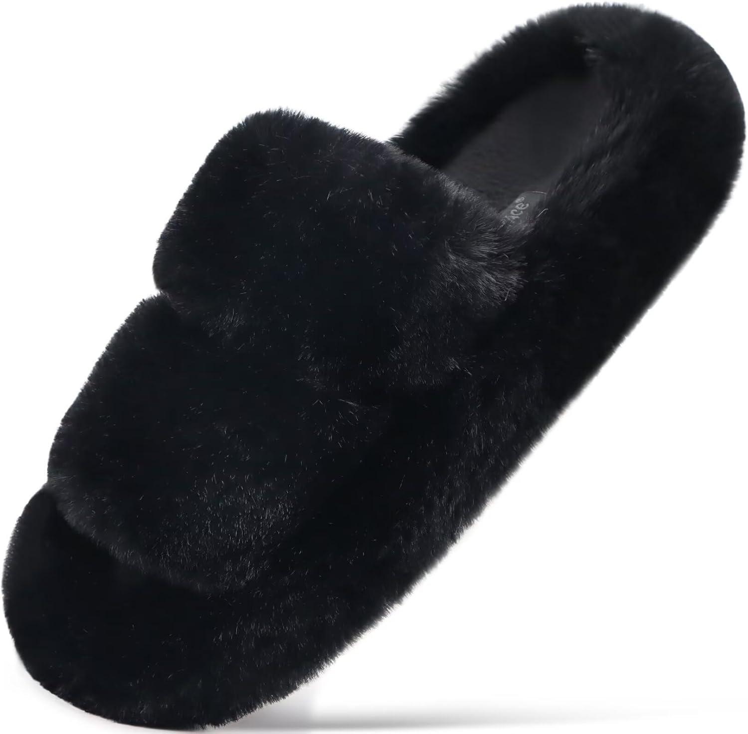 COFACE Women’s Fuzzy Slippers Memory Foam Open Toe Slip On House Shoes Size 5-11(Black)