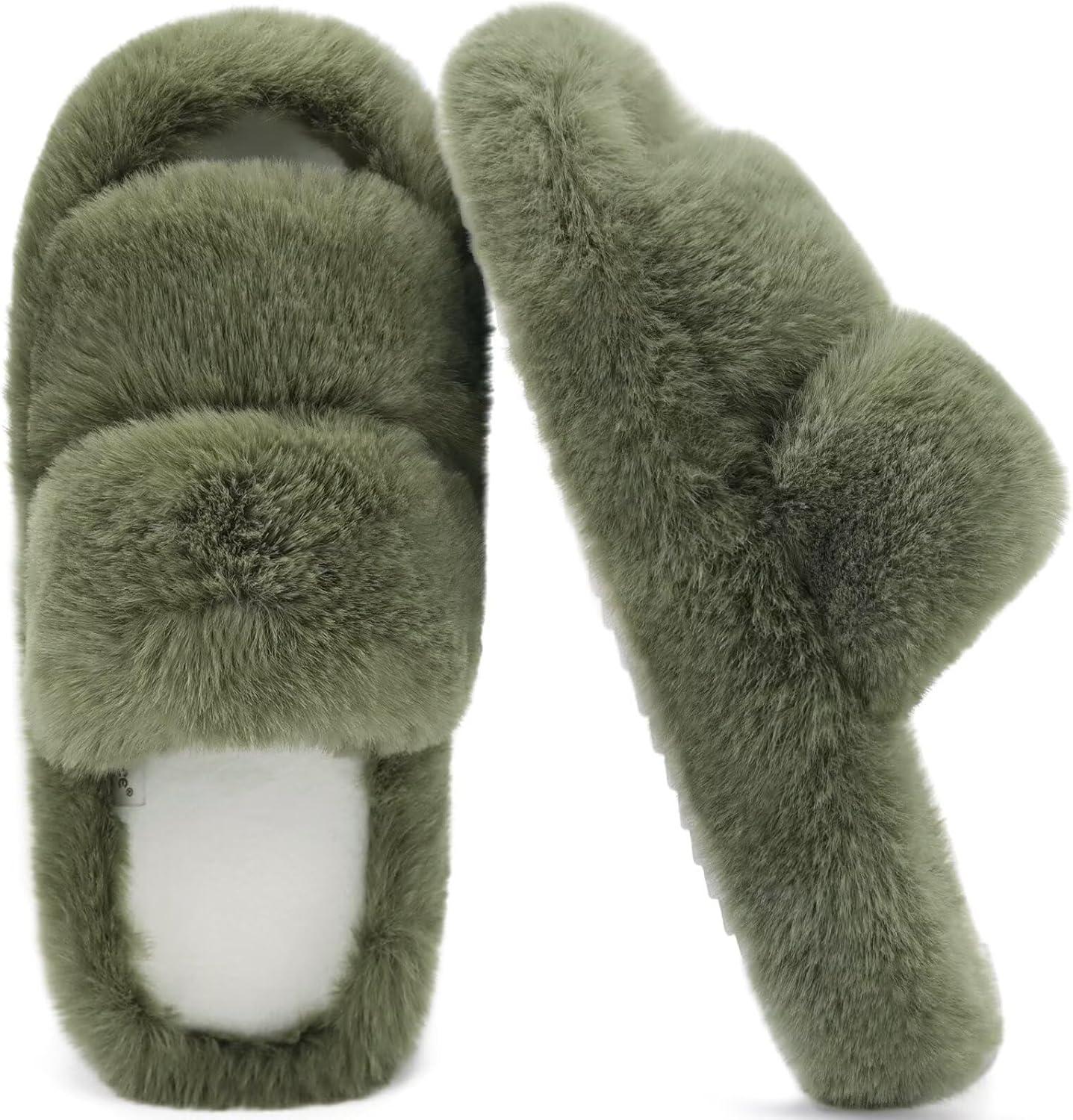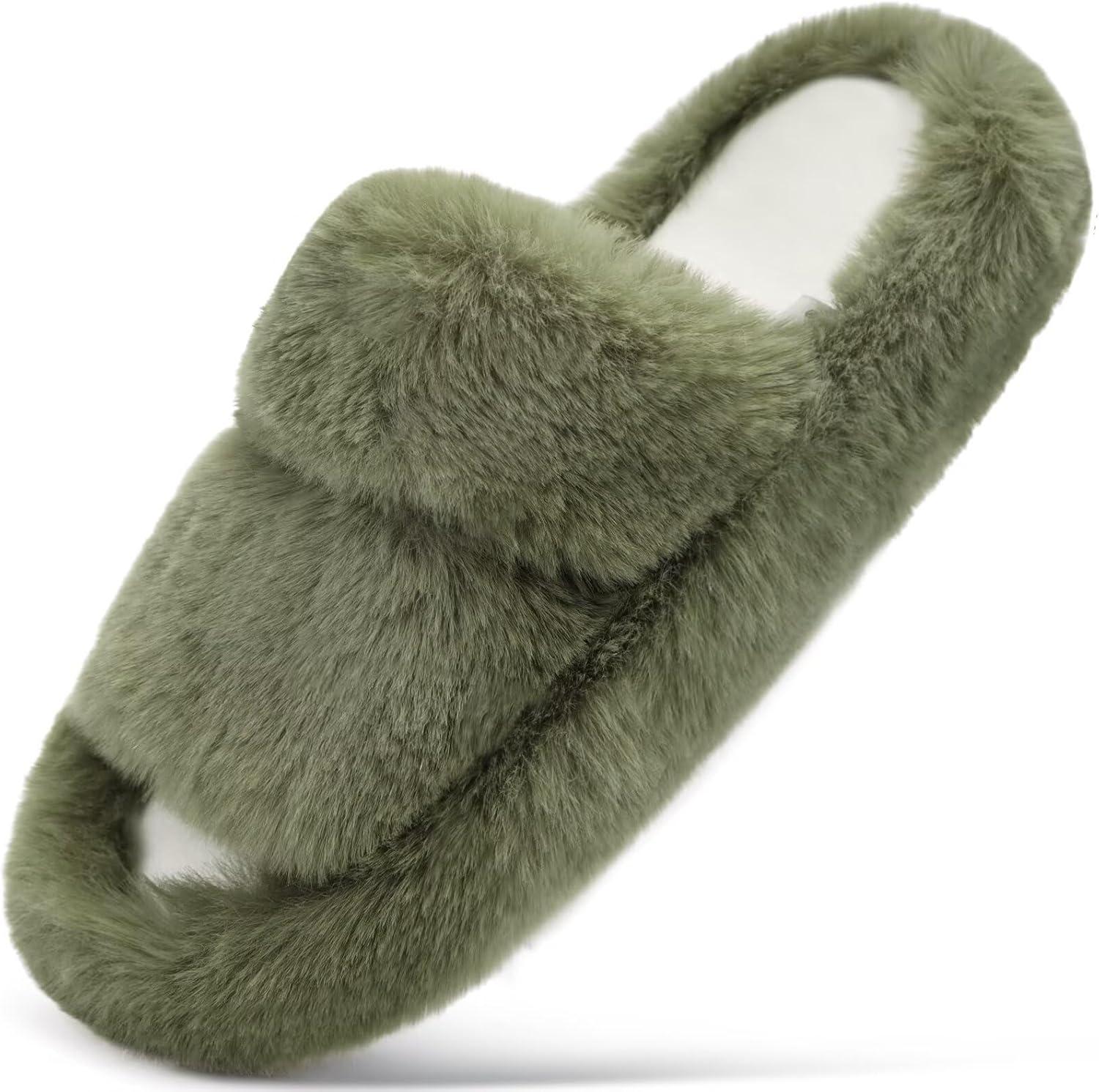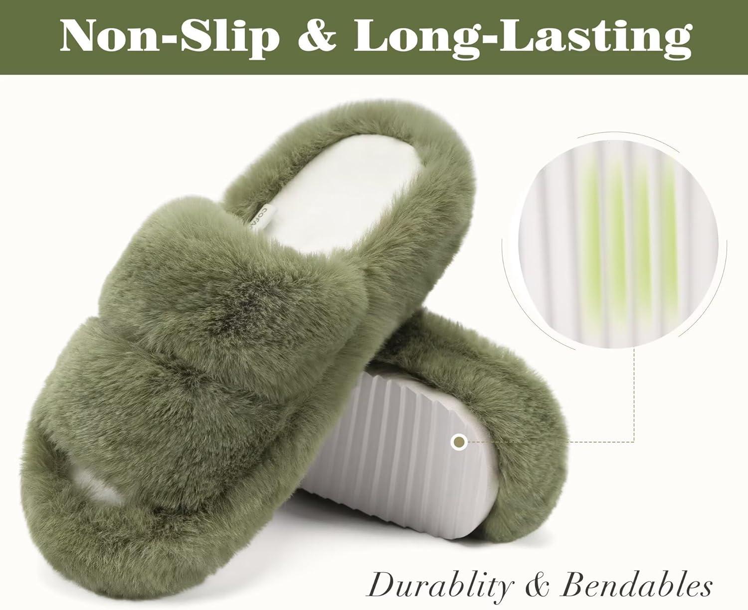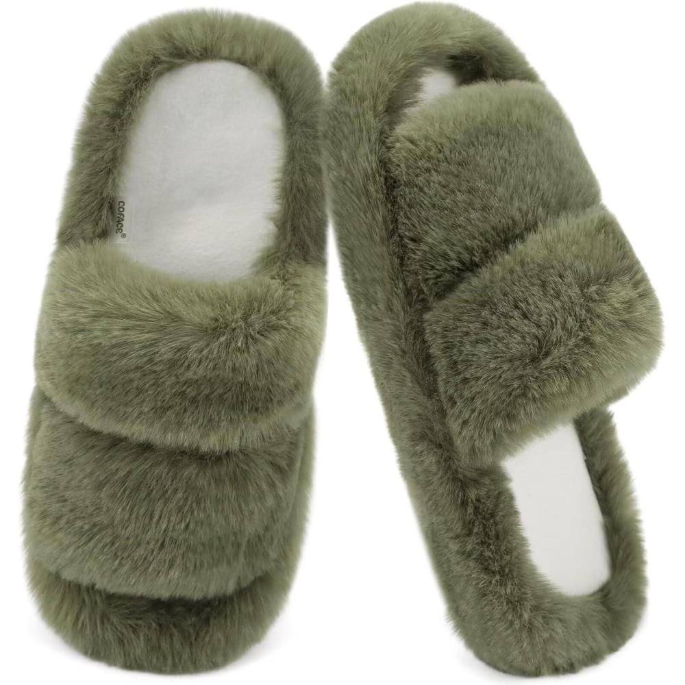 COFACE Women’s Fuzzy Slippers Memory Foam Open Toe Slip On House Shoes Size 5-11(Green)