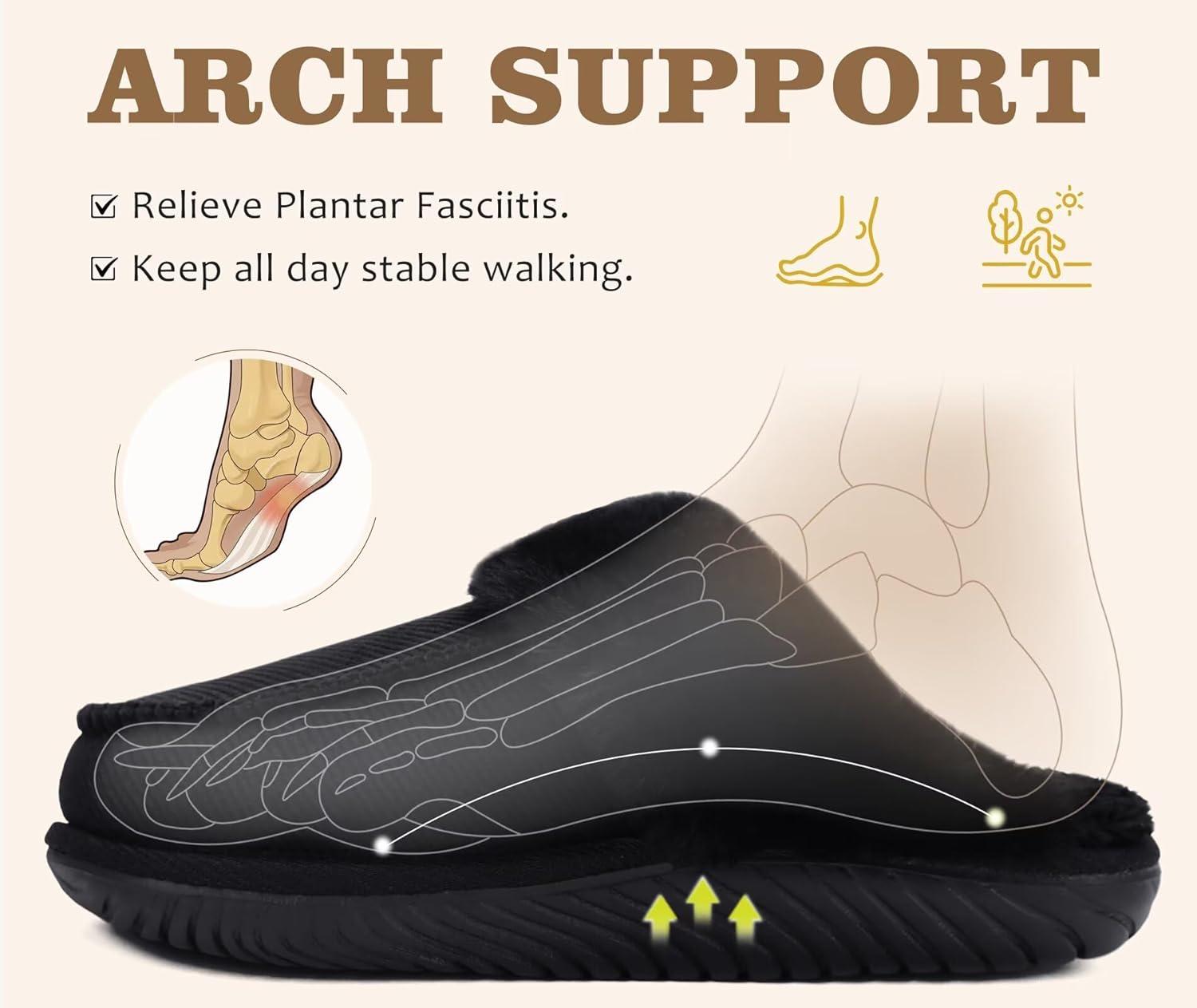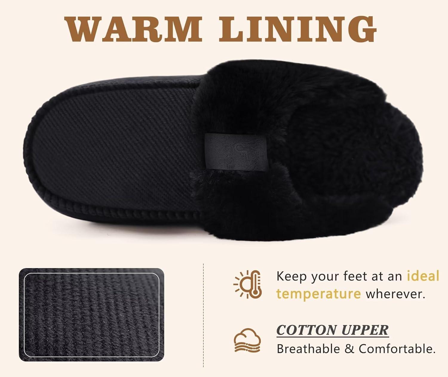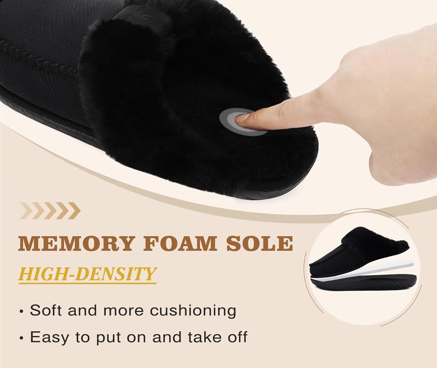 COFACE Womens Memory Foam Cushion Slippers Warm Cozy Fuzzy Faux Fur Winter House Shoes Moccasin Indoor Outdoor With Arch Support Rubber Sole(Black V)