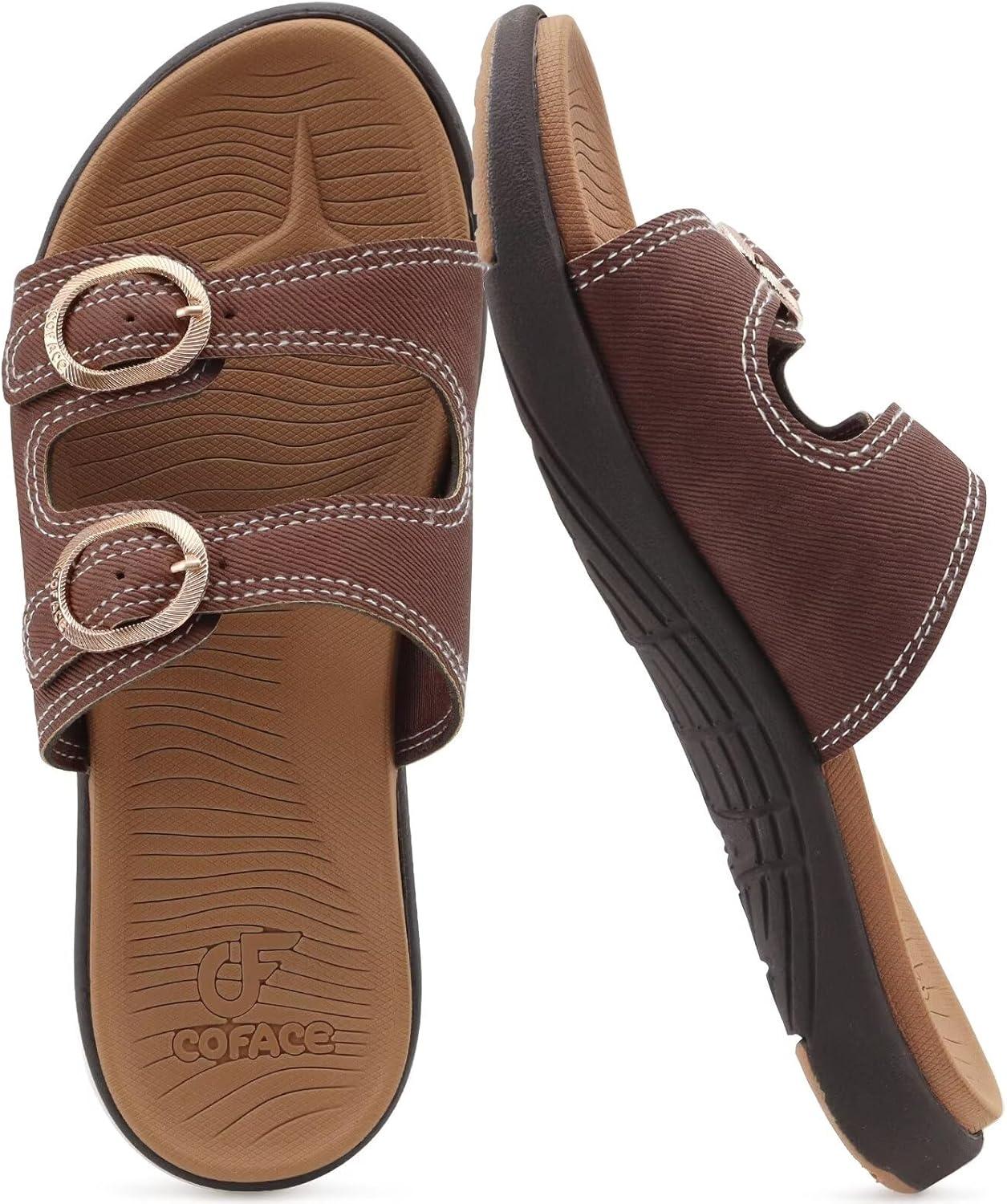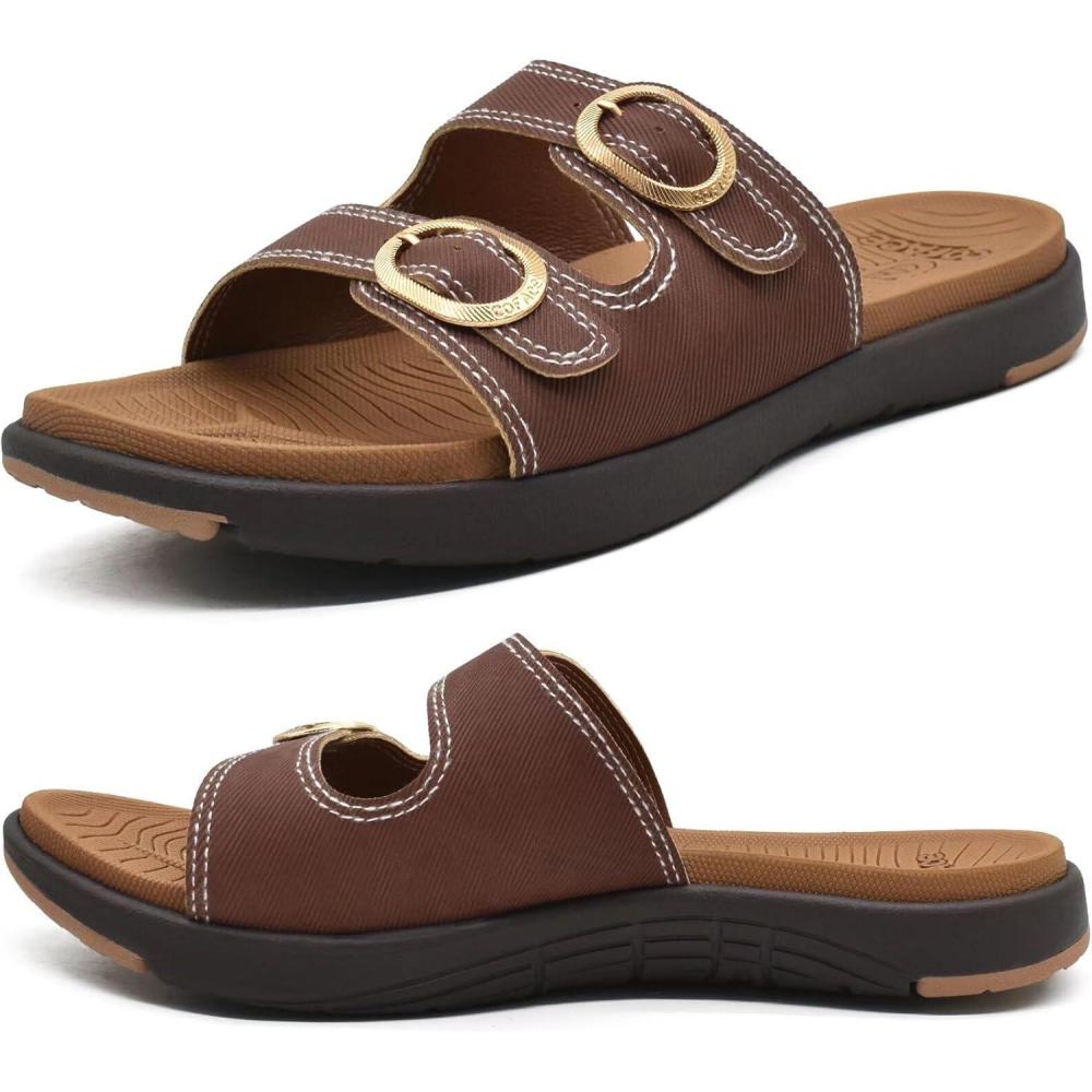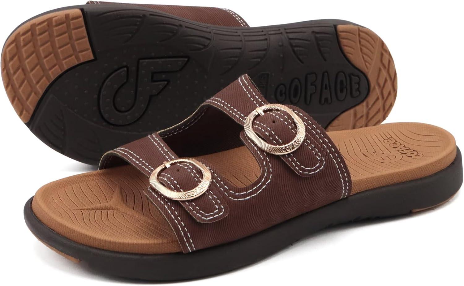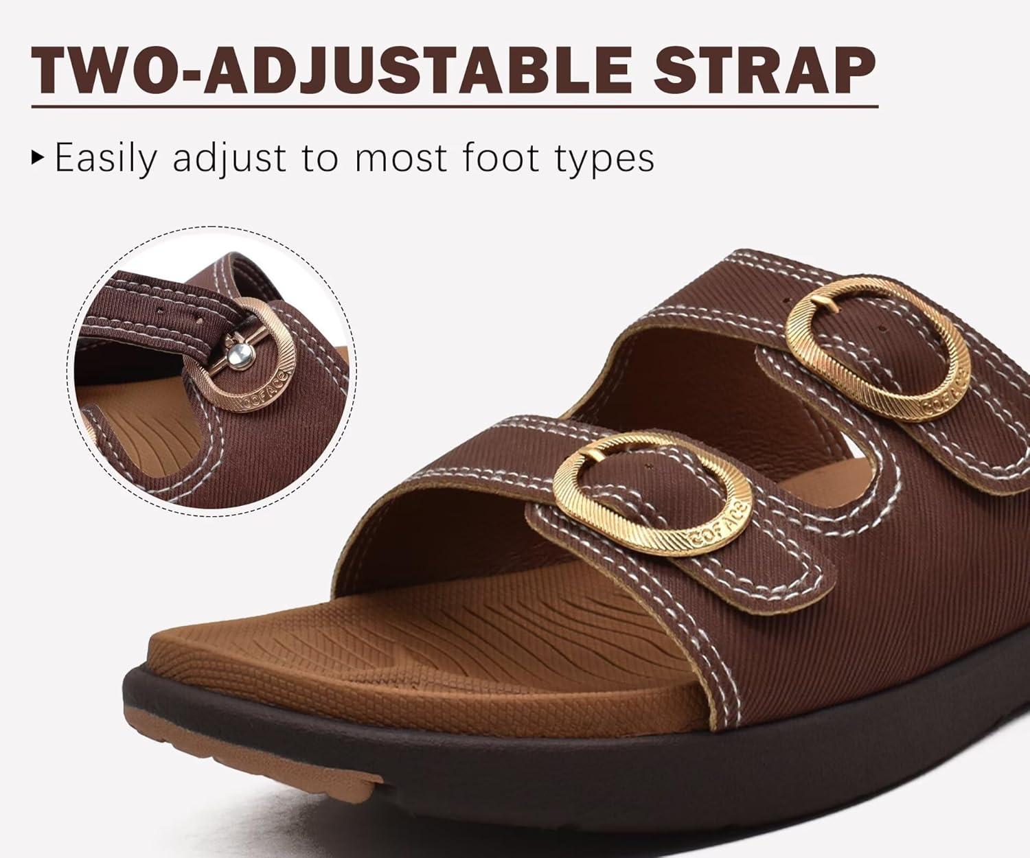 COFACE Womens Orthotic Slides Comfort Plantar Fasciitis Arch Support Slip on Flat Sandals Ladies Soft Cushion Fashion Yoga Mat Slippers With Adjustable Straps(Brown)
