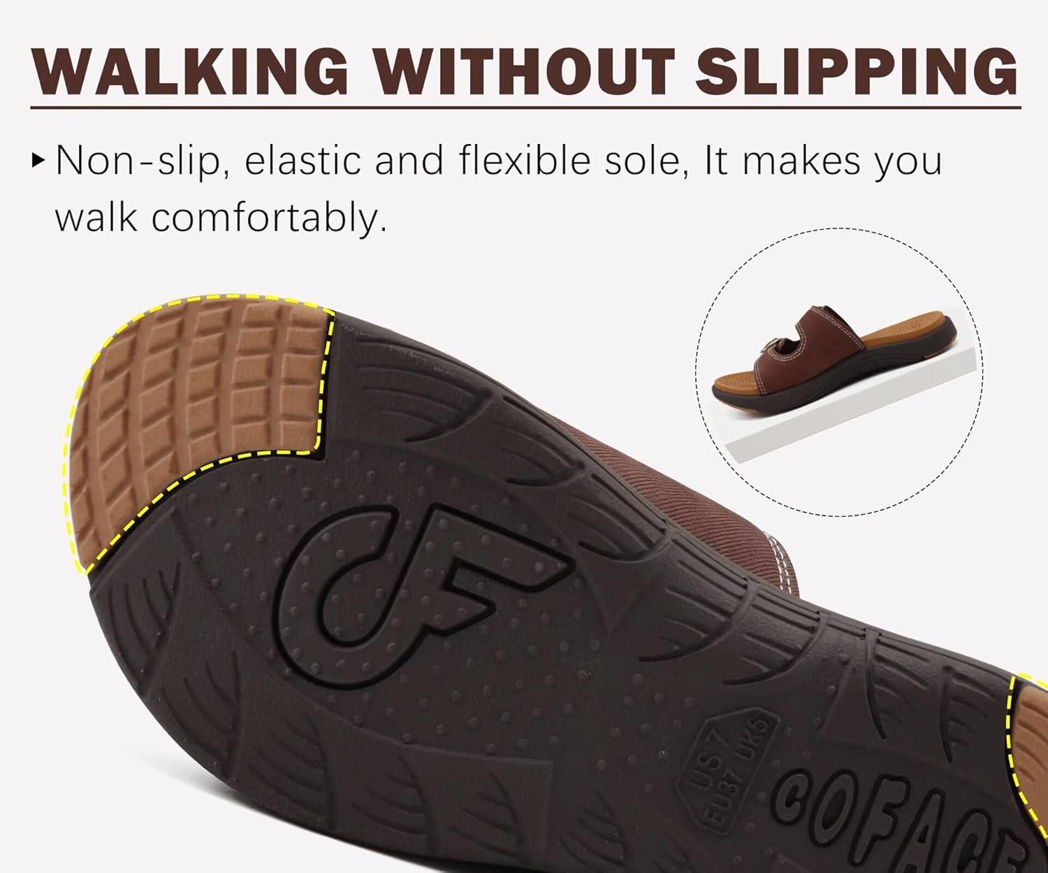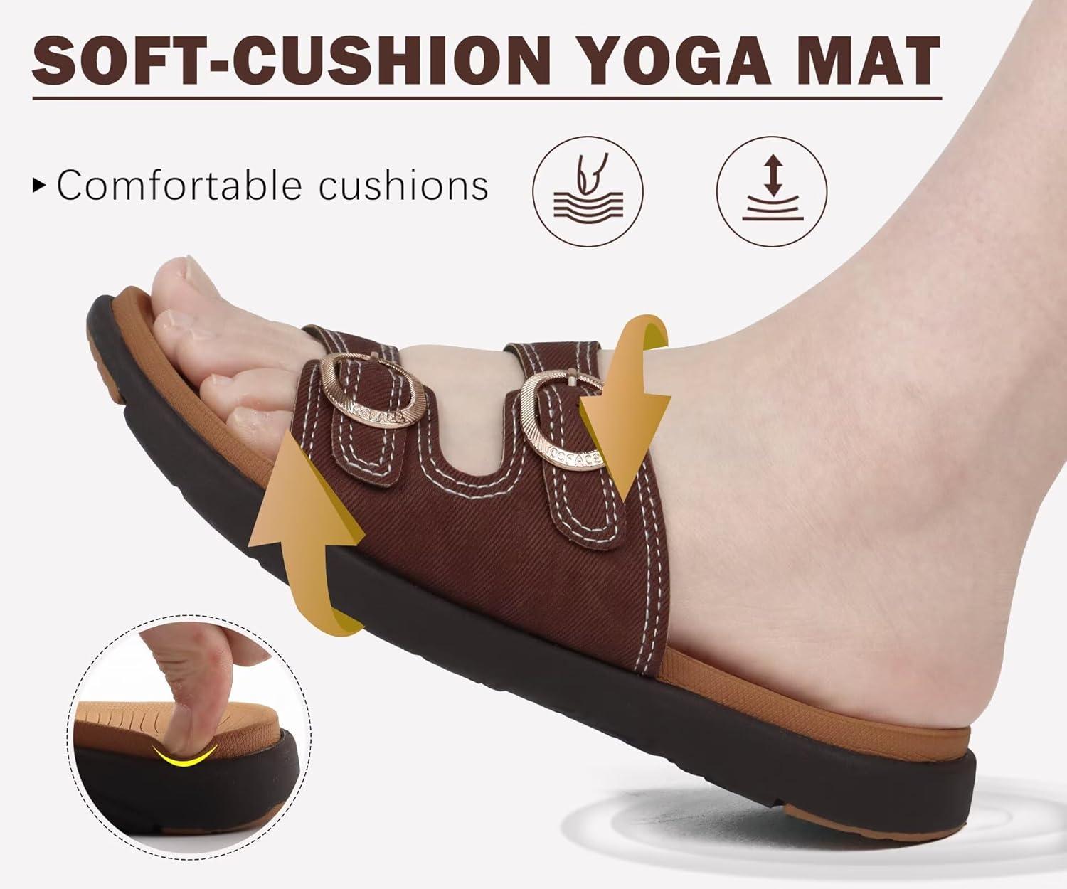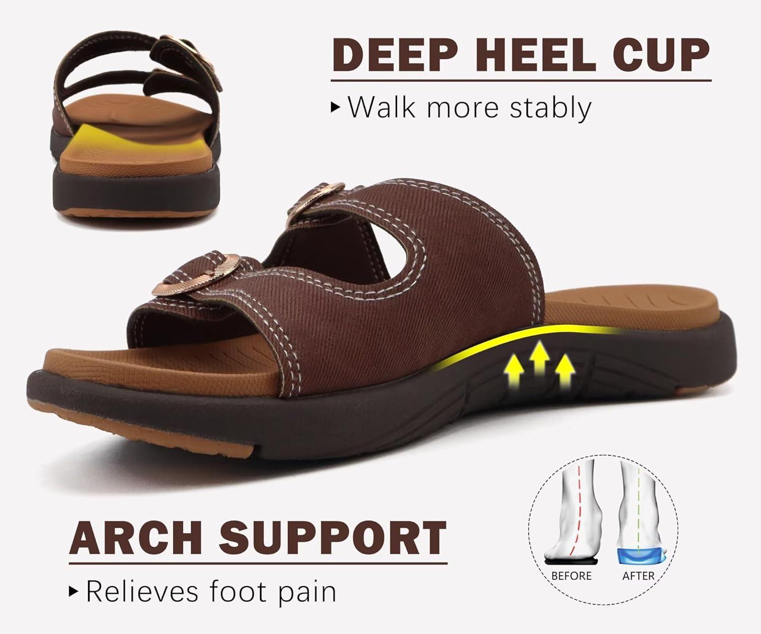 COFACE Womens Orthotic Slides Comfort Plantar Fasciitis Arch Support Slip on Flat Sandals Ladies Soft Cushion Fashion Yoga Mat Slippers With Adjustable Straps(Brown)