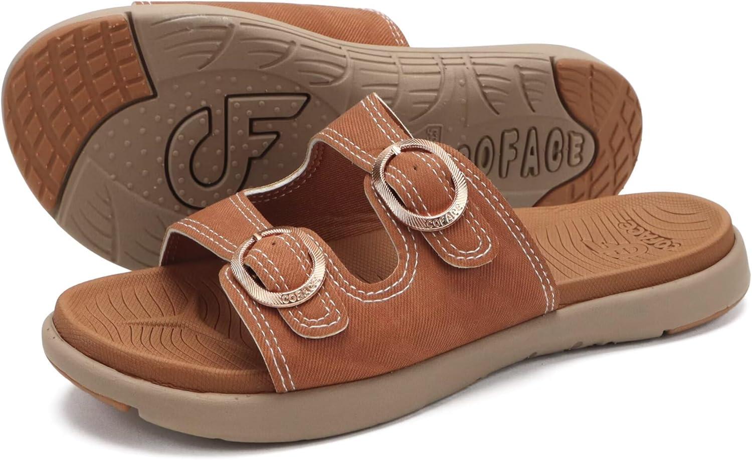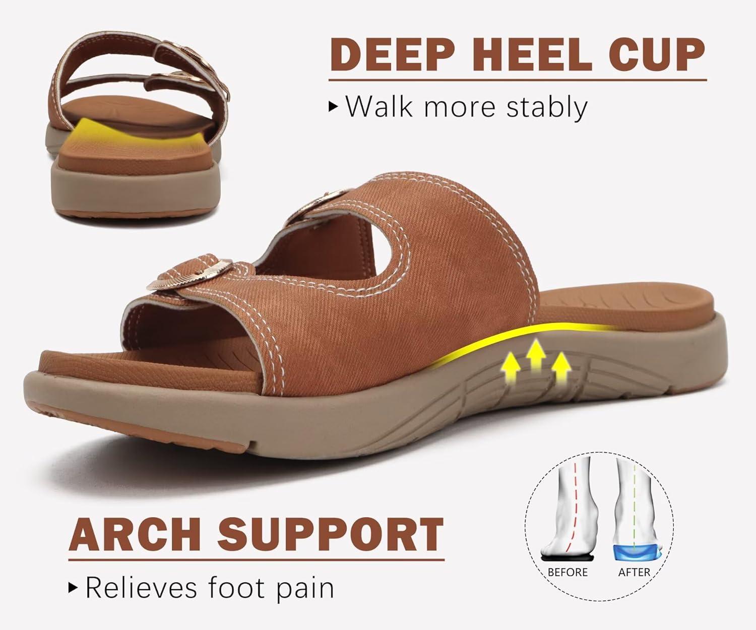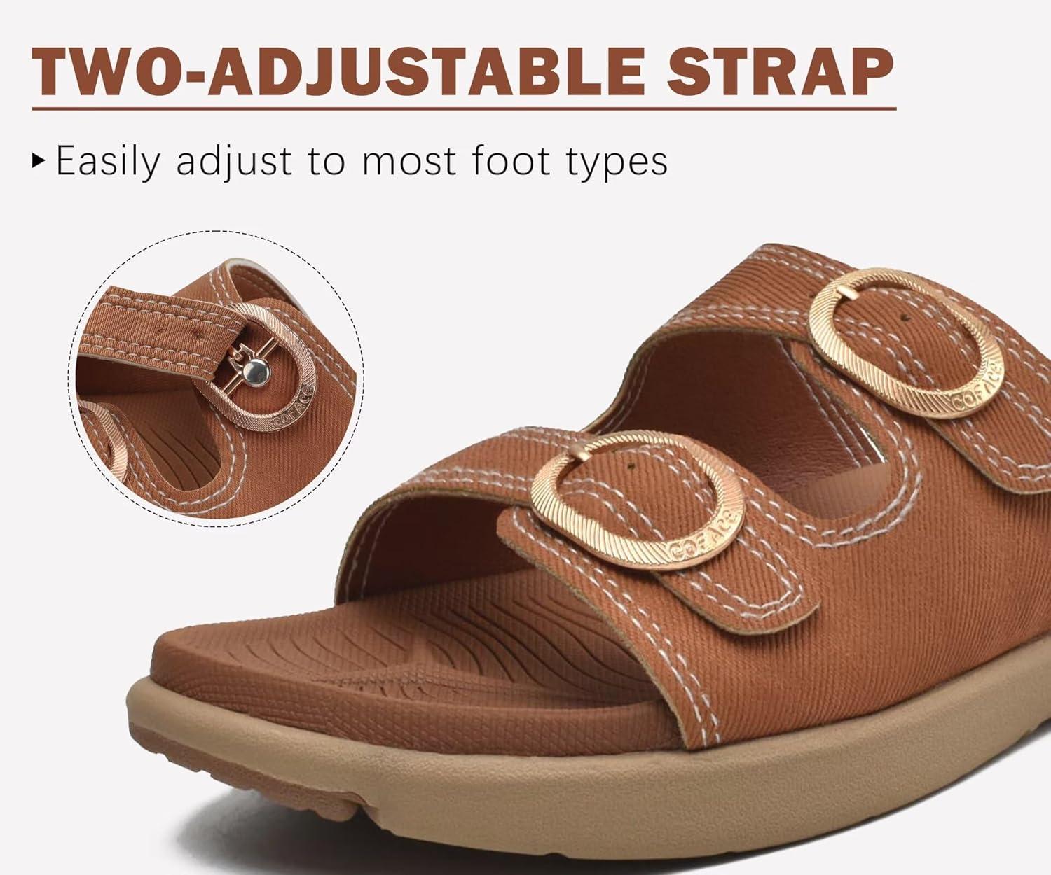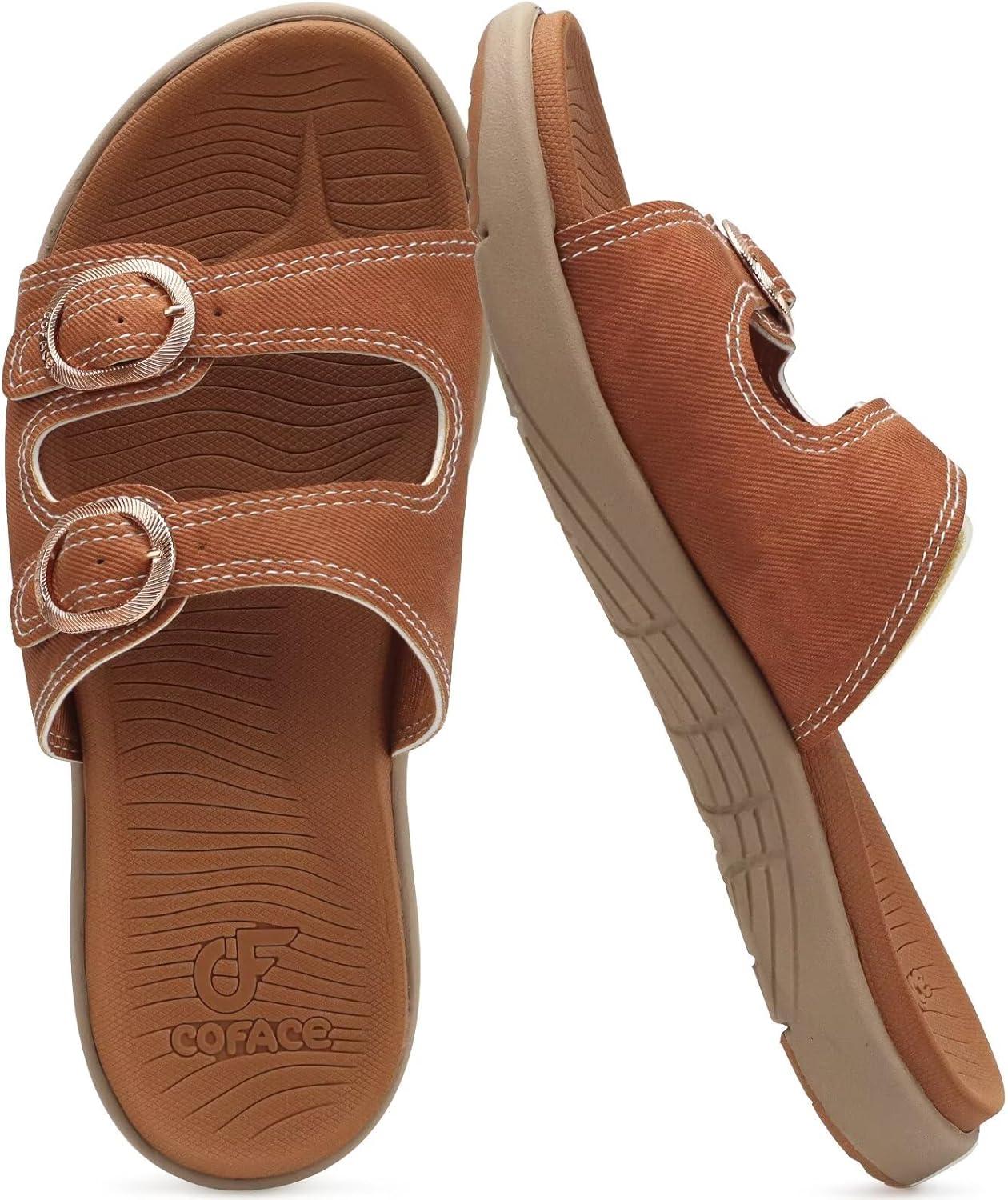 COFACE Womens Orthotic Slides Comfort Plantar Fasciitis Arch Support Slip on Flat Sandals Ladies Soft Cushion Fashion Yoga Mat Slippers With Adjustable Straps(Tan)