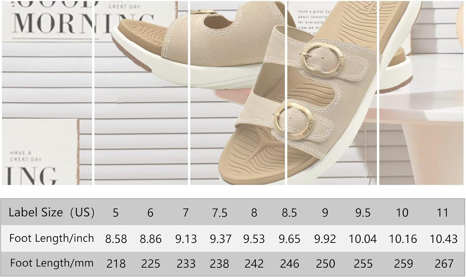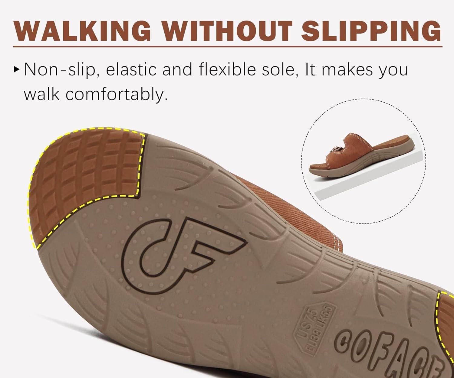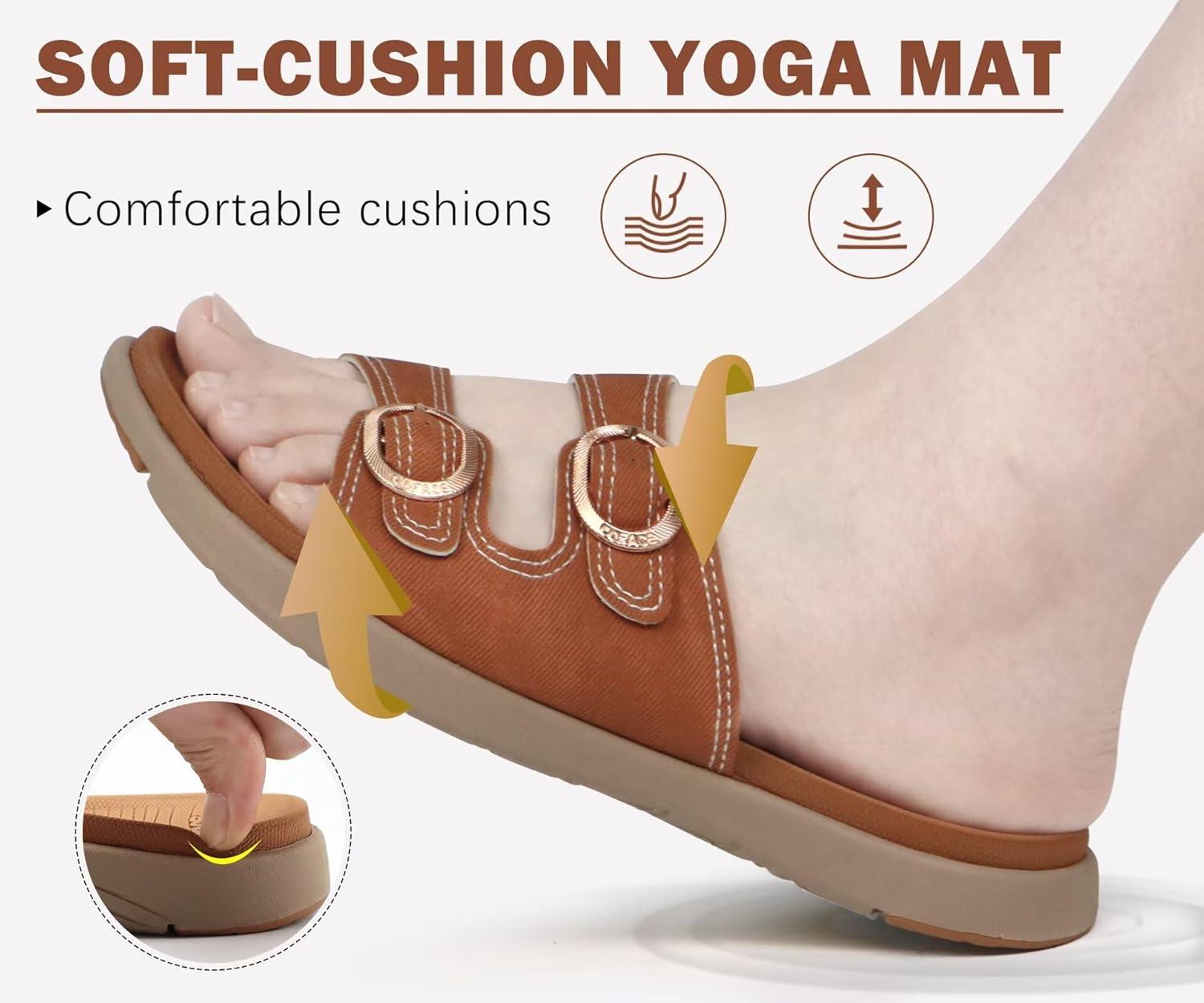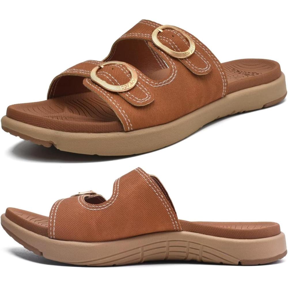 COFACE Womens Orthotic Slides Comfort Plantar Fasciitis Arch Support Slip on Flat Sandals Ladies Soft Cushion Fashion Yoga Mat Slippers With Adjustable Straps(Tan)